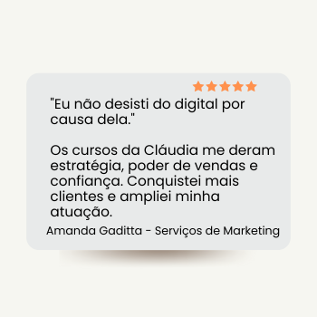 Com 5 anos de experiência no mercado digital, Cláudia Mastri já ajudou inúmeras pessoas a transformarem seus serviços em negócios lucrativos e sustentáveis. Especialista em marketing digital, vendas e posicionamento, ela se dedica a descomplicar o caminho até a conquista de clientes — mesmo para quem está começando do zero.